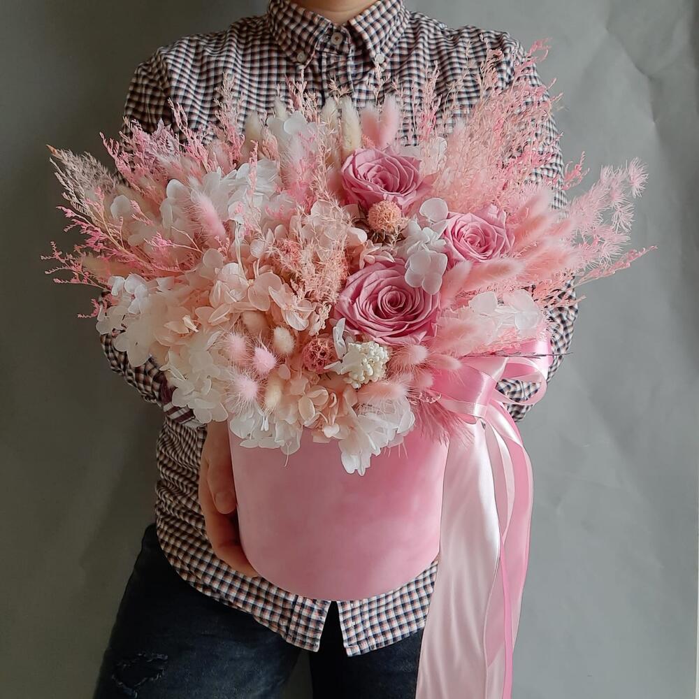 Роза стабилизированная – 3 шт.гортензия стабилизированная – 2 шт.лагурус (сухоцвет)пучок – 2 шт.Лимониум – 2 шт.аспарагус стабилизированный – 2 шт.папоротник стабилизированный – 3 шт.ветки декоративные – 15 шт.Оазис для сухоцветов – 1 шт.Коробка шляпная бархатная – 1 шт.Лента атласная – 3 шт.перо декоративное – 2 шт.