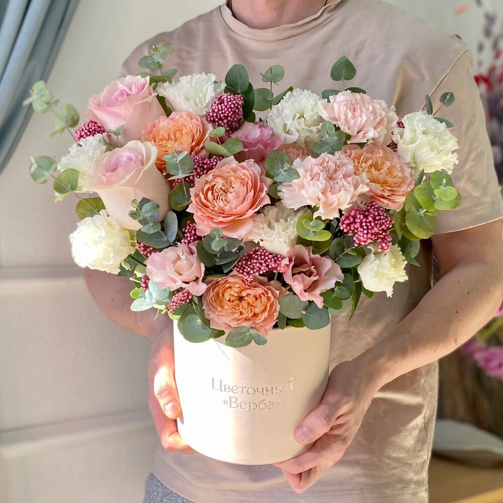 Кустовая роза – 2 шт.Гвоздика – 3 шт.Коробка шляпная – 1 шт.Роза розовая – 2 шт.эустома розовая – 1 шт.эустома белая – 2 шт.озотамнус стабилизированный – 9 шт.эвкалипт композиционный – 30 шт.