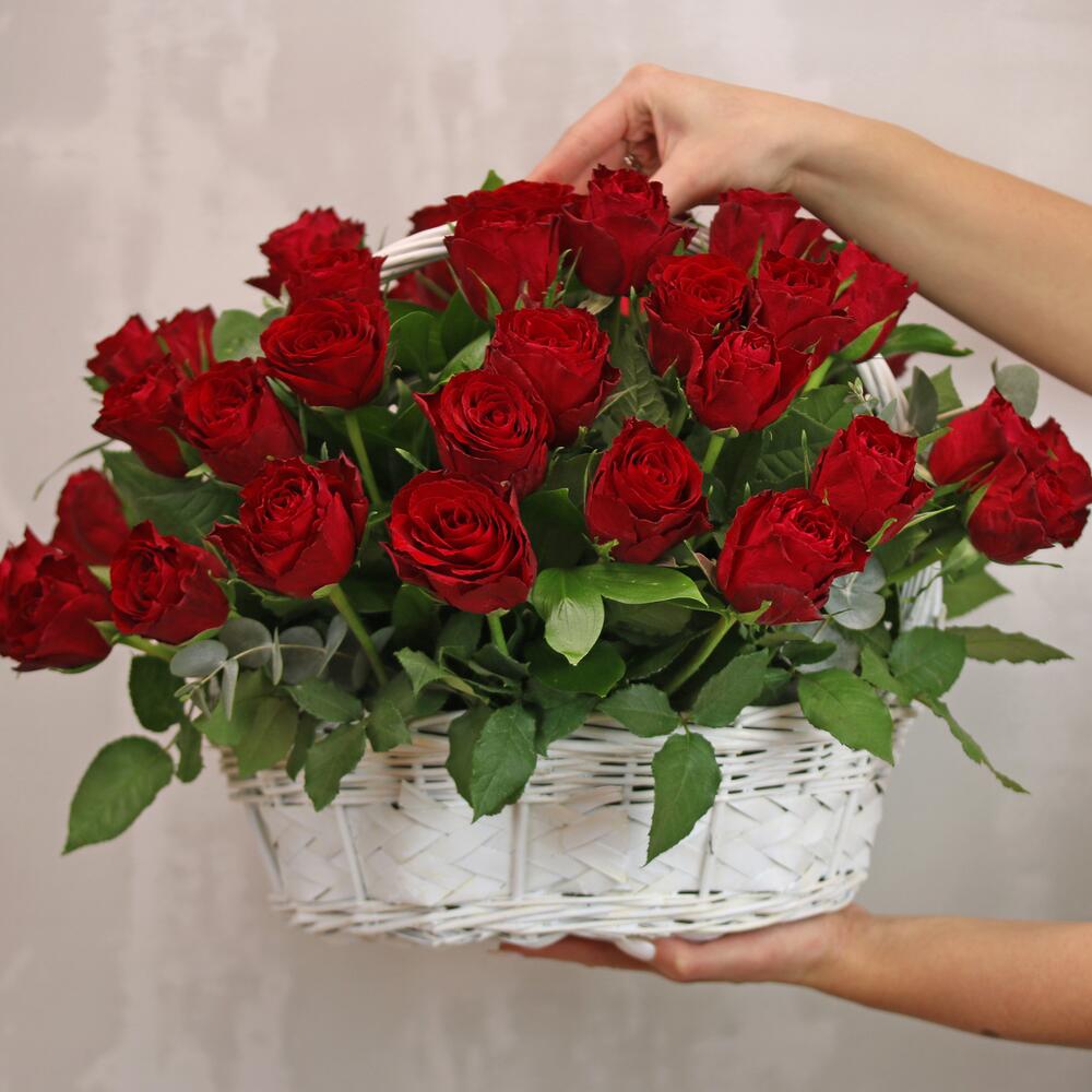 роза кения 35-40 см – 51 шт.Эвкалипт – 1 шт.Оазис – 1 шт.Корзина – 1 шт.