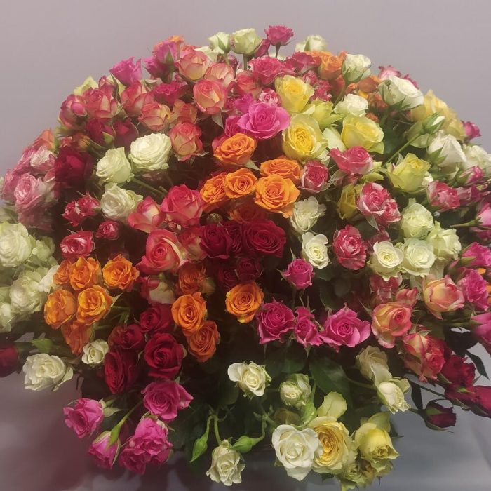 роза кустовая микс – 81 шт.Корзина плетеная – 1 шт.Оазис флористический – 3 шт.