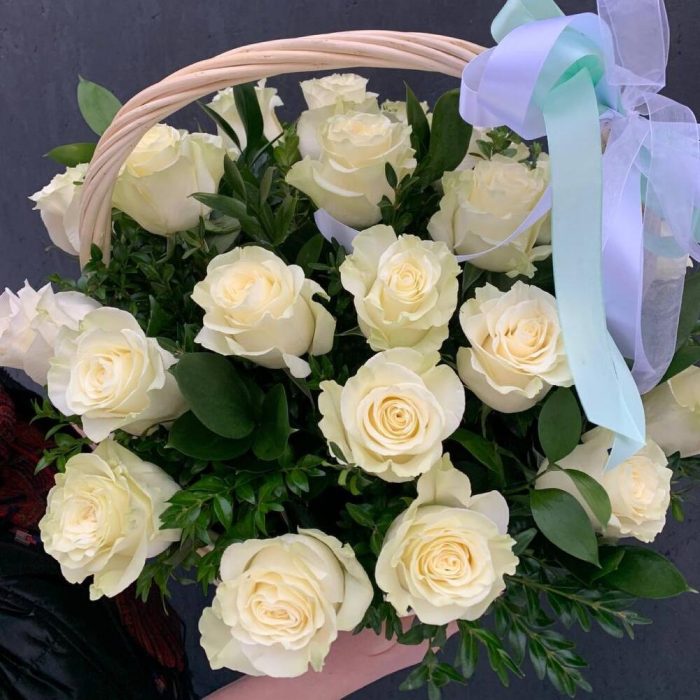 Корзина – 1 шт.Рускус – 10 шт.Роза белая – 25 шт.Оазис флористический – 1 шт.