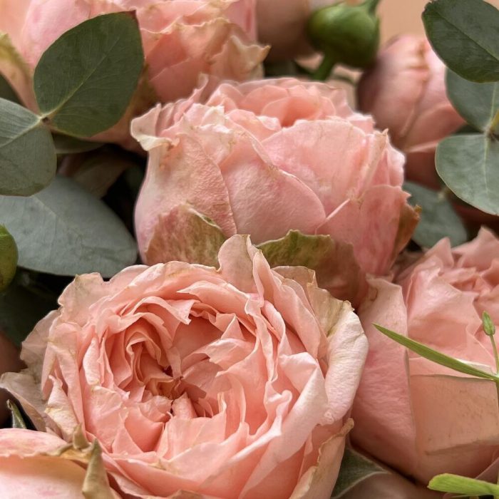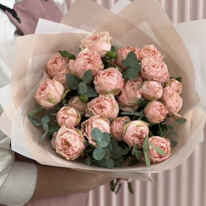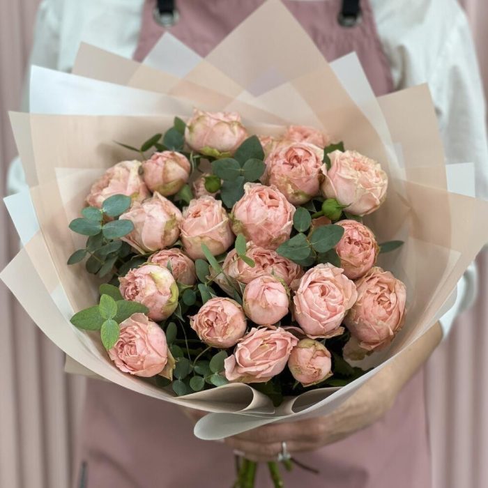 Букет роз , альстромерий и эвкалипта в дизайнерской упаковке