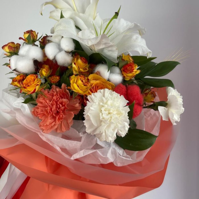 Роза Оранж – 2 шт.Кустовая роза – 2 шт.Фисташка – 4 шт.Лилия белая – 1 шт.Пленка матовая – 6 шт.Хлопок натуральный – 2 шт.Диантус сортовой – 3 шт.