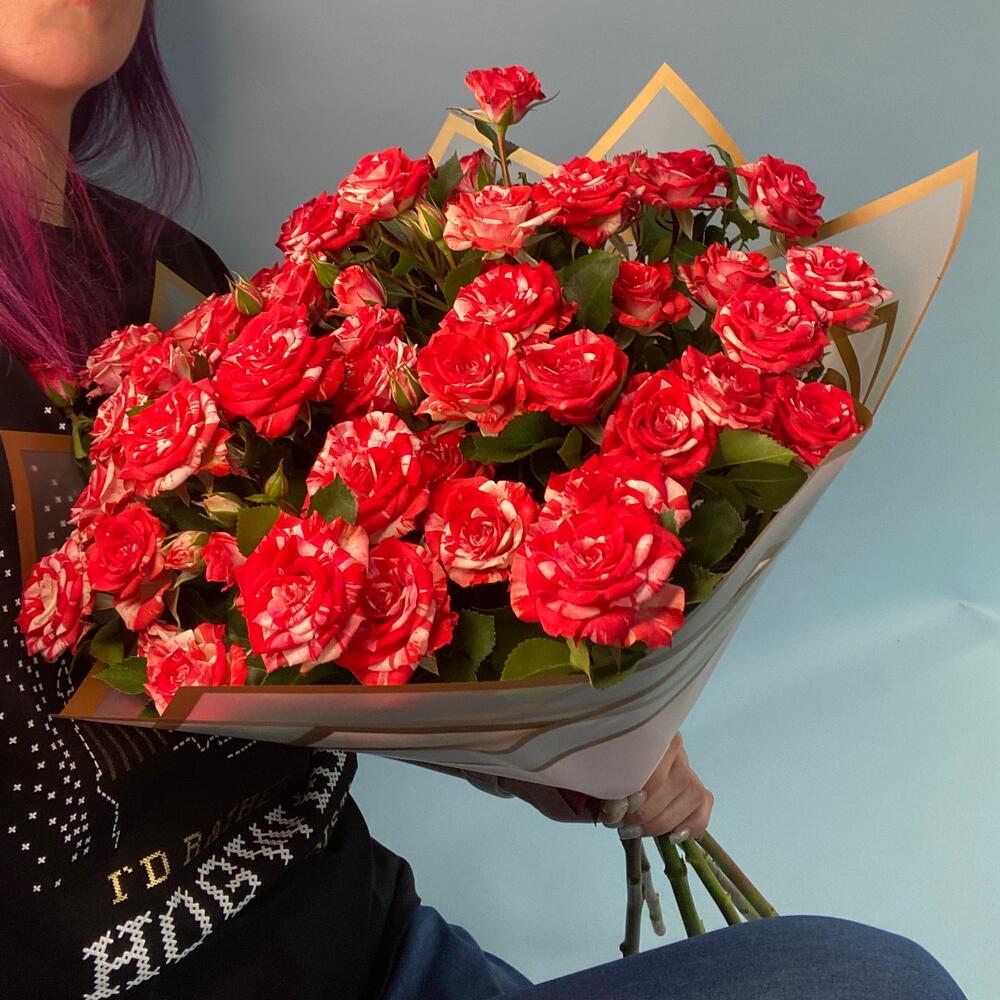 Кустовая роза – 7 шт.Упаковка дизайнерская – 2 шт.Лента атласная – 1 шт.