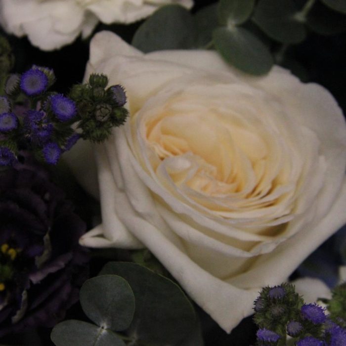Дельфиниум – 9 шт.Лизиантус – 11 шт.Диантус – 15 шт.Роза пионовидная – 7 шт.Твидия – 5 шт.Эвкалипт – 9 шт.Фисташка – 4 шт.Лента атласная – 3 шт.