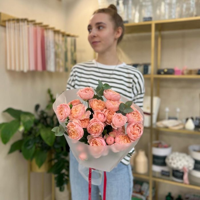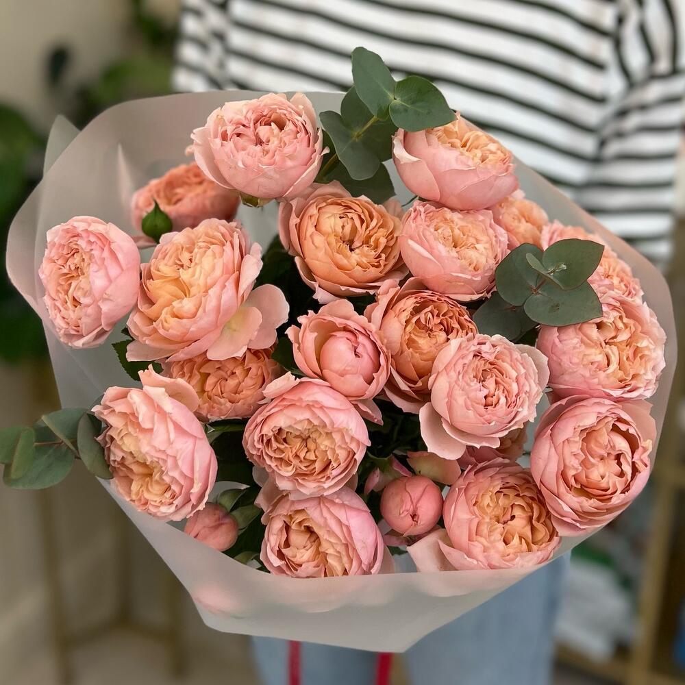 джульетта роза пионовидная – 5 шт.Эвкалипт – 1 шт.Упаковка матовая – 3 шт.Лента брендированная – 1 шт.Кризал – 1 шт.