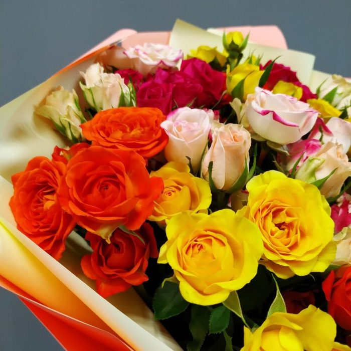 Все женщины любят цветы, но большинство из них предпочитает розы. Еще бы, ведь они завораживают своей красотой и покоряют своим ароматом.Прекрасный букет из кустовых роз, станет идеальным подарком для самых любимых и близких!Памятка для букета:1. Чистая вода раз в сутки.2. Стебли подрезаем на 0,5см при каждой смене воды.3. Ставим в прохладное место, но не у окна.4. Чтобы вода оставалась свежей, не допускайте попадания листьев и лепестков в воду.Друзья, обратите внимание, что цвет упаковки может быть другим, в зависимости от наличия на складе.