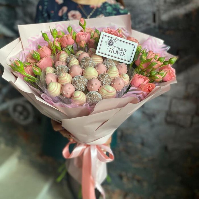 Съедобный фруктовый букет из клубники в шоколаде и эустомы в дизайнерской упаковке