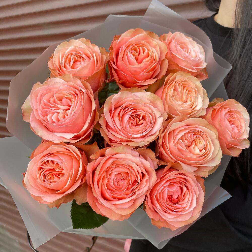 Шикарный букет из 11 крупных пионовидных роз «Кахала».Персиковые крупные бутоны с нежно-розовыми лепестками. Эффектный подарок на любой праздник. Очень долго стоят.
