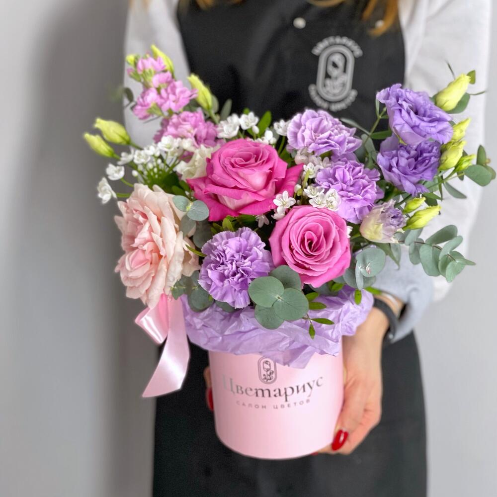 пион роза – 1 шт.Роза Эквадор – 2 шт.фиолетовая гвоздика – 3 шт.Маттиола – 1 шт.Лизиантус – 1 шт.Аллиум – 3 шт.Фисташка – 1 шт.Эвкалипт – 1 шт.Шляпная коробка – 1 шт.