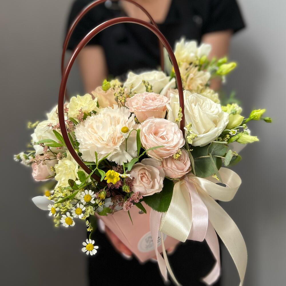Сумочка с ручками из плотного картона ламинированого – 1 шт.Роза белая – 3 шт.Роза кустовая – 3 шт.Эустома – 1 шт.Гвоздика – 2 шт.зелень декоративная – 5 шт.Лента атласная – 2 шт.