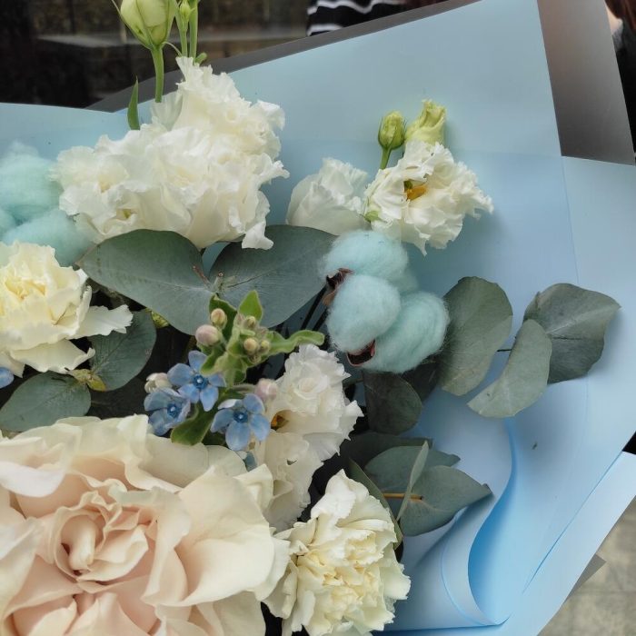 Роза пионовидная – 2 шт.Диантус – 3 шт.Лизиантус – 2 шт.Хлопок – 3 шт.Оксипеталум – 2 шт.Упаковка – 2 шт.Лента – 2 шт.