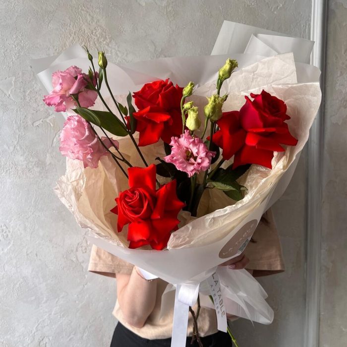 Лизиантус махровый розовый – 2 шт.Роза французская – 3 шт.Авторская упаковка – 1 шт.
