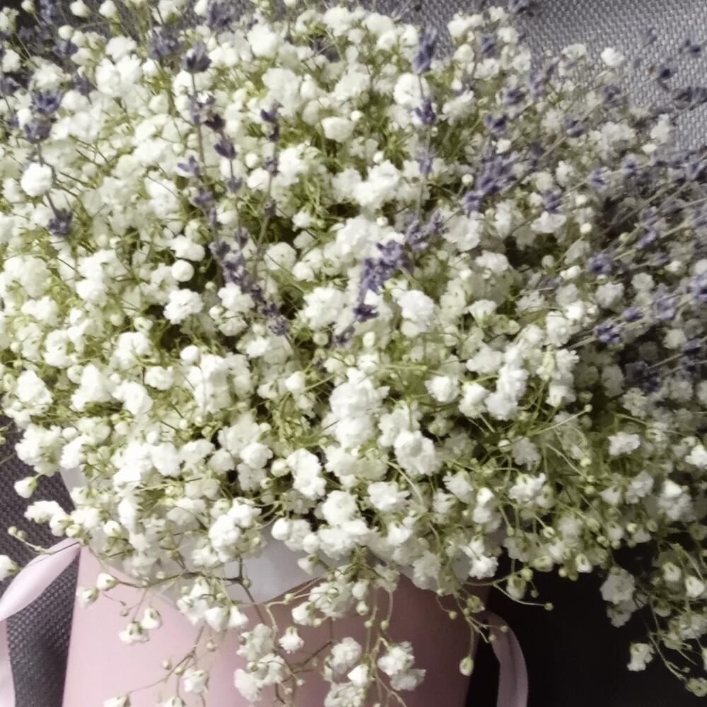Гипсофила – 25 шт.Лаванда (сухоцвет) – 35 шт.Шляпная коробка – 1 шт.Пакет подарочный – 1 шт.Флористическая губка – 1 шт.