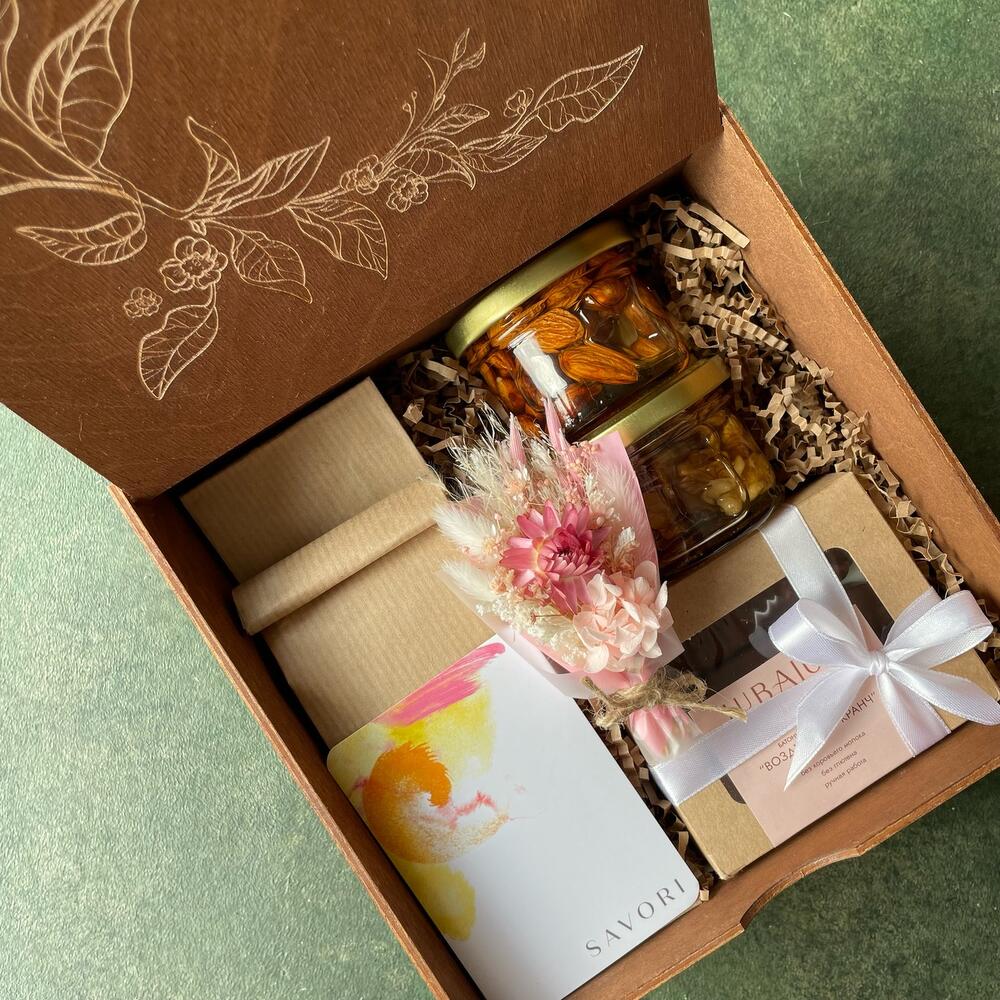 Тёплый подарочный набор SAVORI из чая и полезных лакомств подойдёт к любому приятному поводу.Слева положили два чая: укрепляющий иммунитет иван-чай двойной ферментации со сладким ягодным ароматом; нежный зелёный чай с имбирём и апельсином. Справа полезные десерты – грецкий орех и миндаль в меду, шоколадные ПП-батончики. В коробочке два шоколадных батончика “Воздушный кранч”, полезный вариант Picnic. В составе какао тертое, изюм, воздушный рис, печенье (рисовая мука, миндальная мука, кокосовое масло, сироп топинамбура), кокосовый сахар, тростниковый сахар.В середине букетик из сухоцветов. Сохраняет свою красоту не менее года. ***Букет – ручная работа. Ваш может чуть отличаться внешне, но состав такой же. Всё сладкое и ароматное кладём в коробку-шкатулку из дерева с двусторонним золотистым узором, завязываем бант атласной лентой.